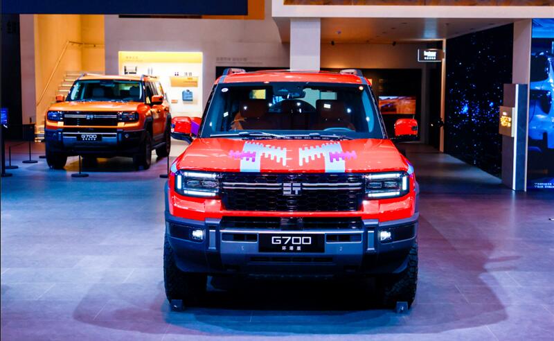 事实上,自上海车展亮相以来,G700就备受市场关注,尤其是作为唯一未上市量产车出战2025环塔拉力赛,以5个赛段冠军、全军团顺利完赛的耀眼成绩,证明“中国电混穿越之王”的实力,赢得越野爱好者的追捧。本届成都车展上,传承环塔穿越荣耀基因的G700环塔版迎来全球首发。采用典藏“烈焰”涂装设计的G700环塔版,完美还原环塔拉力赛激情基因,并配备阿诺达氮气减震,支持±15mm精密高度调节,兼顾沙漠飞坡与戈壁穿越的多场景需求,搭载265/70 R18黑熊AT胎、18寸越野轮毂、铝镁合金殿堂级底盘护板等装备,成就赛道级全域越野性能。